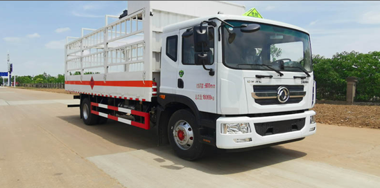 該車為危險品運輸車.隨底盤選裝駕駛室,選裝后部燈具.類項號2.1,2.2.選掛2.1類易燃氣體警示牌或2.2類非易燃無毒氣體警示牌.后部安裝液壓尾板,液壓尾板收起水平長度300mm,尾板質(zhì)量為450kg,側(cè)防護材料:Q235,連接方式:焊接連接,后防護由專用裝置代替,后部專用裝置離地高為480mm;選裝后部不帶尾板樣式時側(cè)、后防護裝置材料:Q235,連接方式均為焊接,后防護截面高100mm,截面寬50mm,下邊緣離地高480mm.選裝無柵欄樣式,選裝后部樣式.僅采用排氣管前置,子午胎,限速裝置,輔助制動裝置和前盤制動器的底盤;限速80km/h.安裝具有衛(wèi)星定位功能的行駛記錄儀;ABS防抱死制動系統(tǒng)生產(chǎn)廠家/型號:1.廣州瑞立科密汽車電子股份有限公司/CM4XL-4S/4M;2.浙江萬安科技股份有限公司/VIE ABS-II.僅選用發(fā)動機型號及油耗值(L/100km)對應(yīng)關(guān)系為: